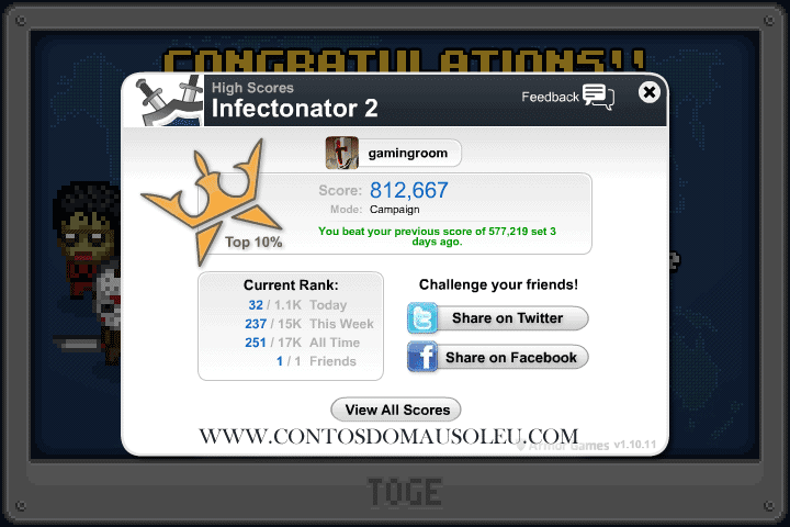 No dia 12 de abril de 2012, consegui ficar 10% no ranking da ArmorGames do Infectonator II, botando a Gaming Room e o Brasil no topo mais uma vez. Bom, pelo menos até ontem! Hehehehe…